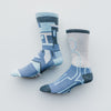 This whimsical design evokes the image of soapy water in honor of Social Spin, which embraces the potential of laundromats for community and sharing. The repeating arches are the floating suds in a frothing washing machine. The blue bubbles, an element from Social Spin’s logo, rise as the horizontal stripes along the foot is the clean water rinsing away the remnants of debris.